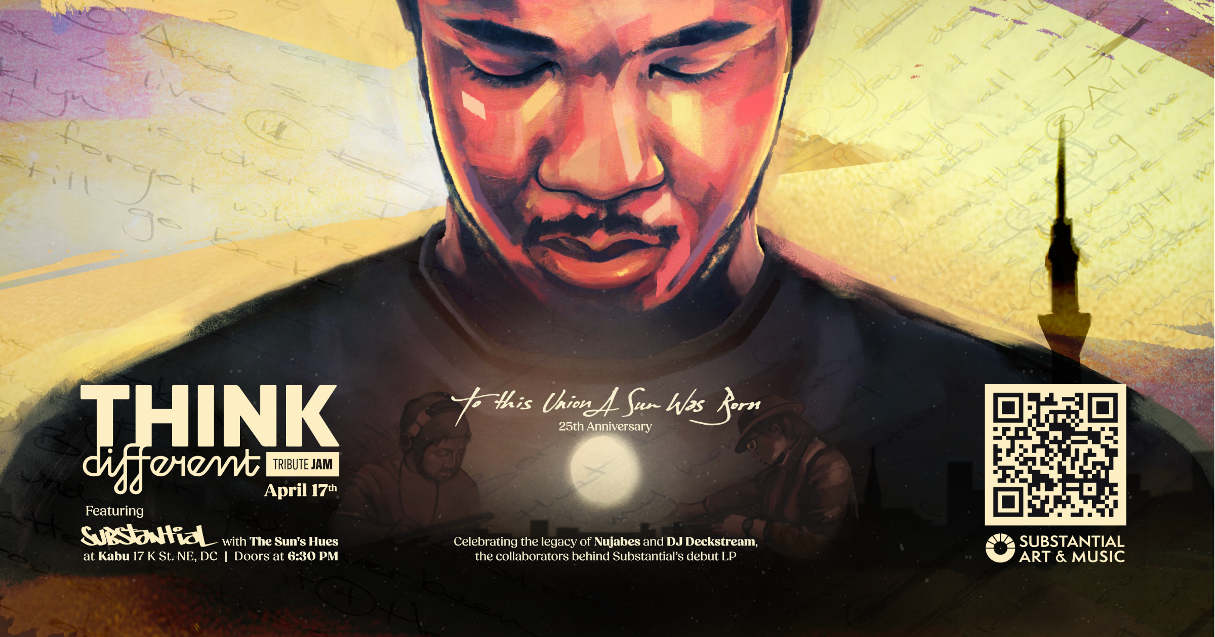 Substantial Art & Music proudly presents Think Different Tribute Jam 2026, taking place April 17, 2026, at Kabu in Washington, DC. This special event celebrates the artistic legacy and global influence of the late Japanese producers Nujabes and Monorisick, who later became known as DJ Deckstream, the visionary collaborators behind Substantial’s debut album, To This Union A Sun Was Born.