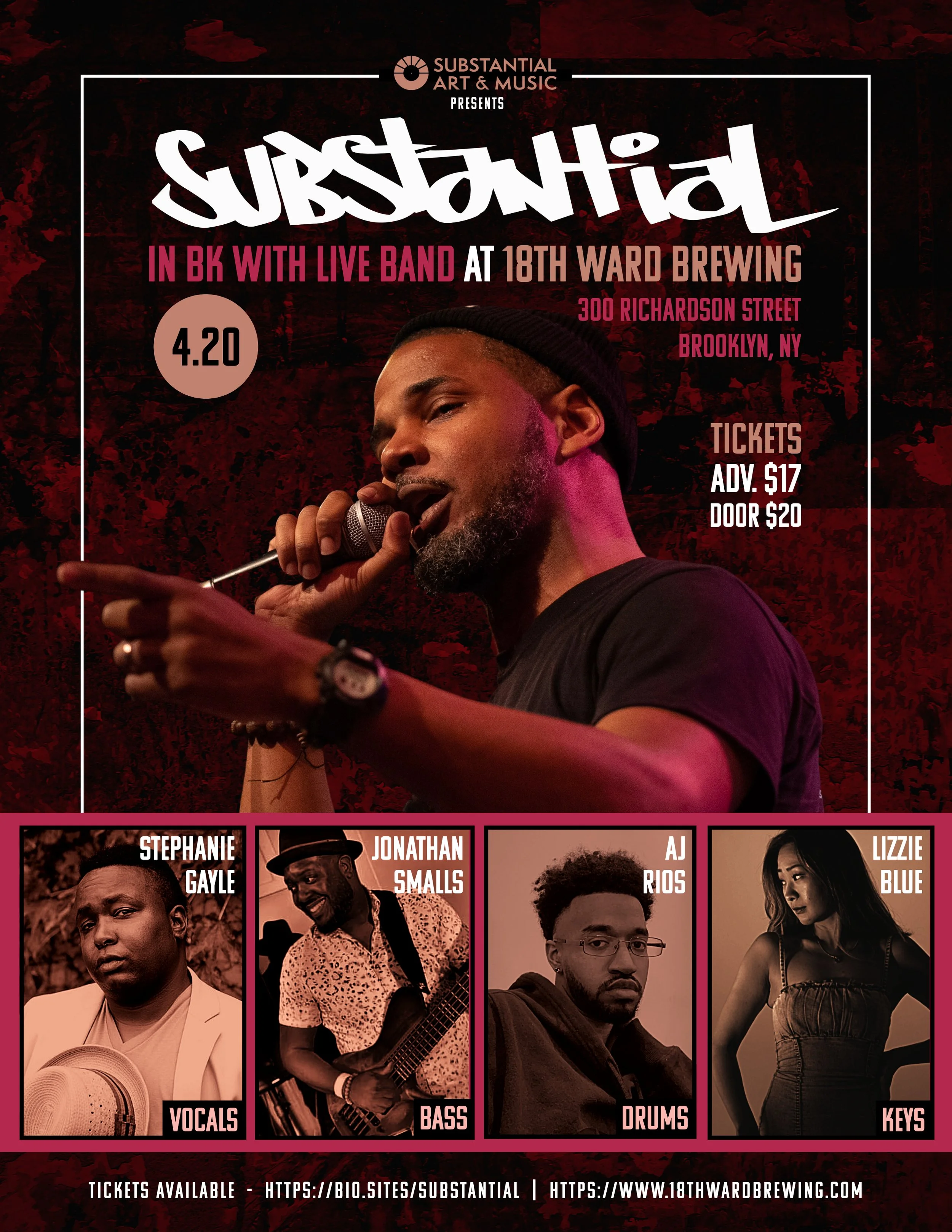 Substantial live with his band at 18th Ward Brewing! Catch international Hip Hop artist, Substantial with his band's debut performance in Brooklyn, NY. He'll be joined by AJ Rios (drums), Lizzie Blue (keys), Jonathan Smalls (bass), and longtime collaborator Stephanie Gayle (vocals) performing live renditions of songs from his latest album as well his classic Nujabes collaborations and more. Live at 18th Ward Brewing located at 300 Richardson Street, Brooklyn NY 11211. Tickets are $17 in advance and $20 at the door.